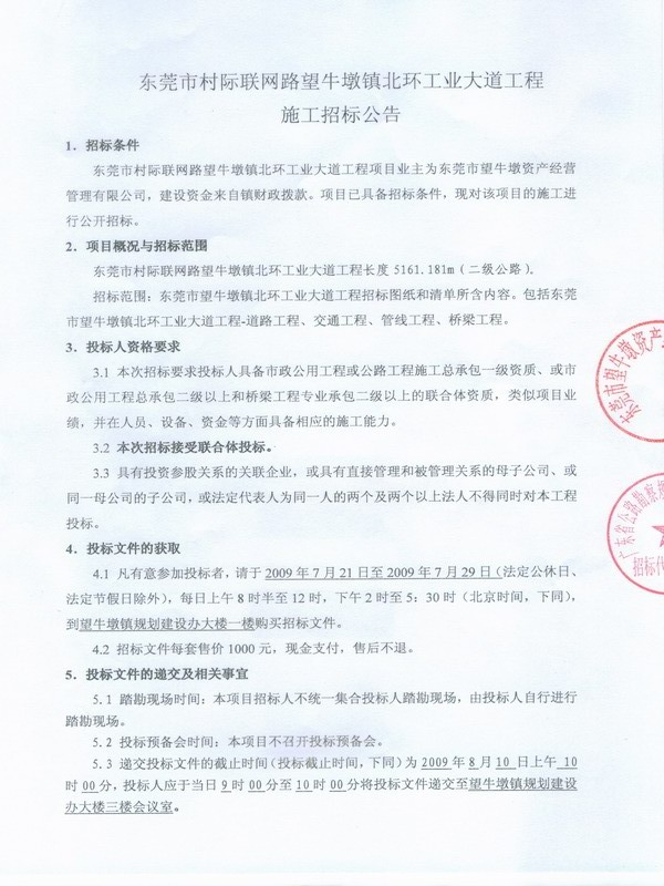 東莞市村際聯網路望牛墩鎮北環工業大道工程施工招標公告