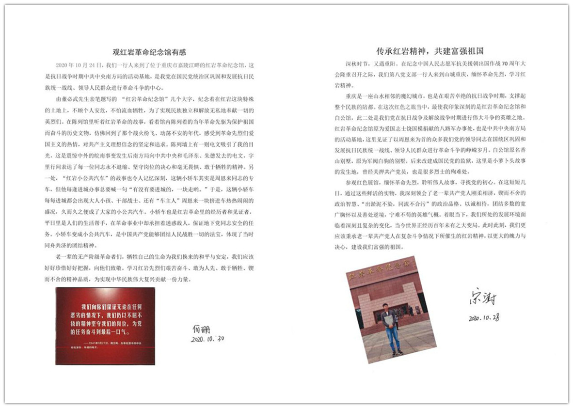 在這次的參觀學習過程中,我們共同緬懷革命先烈,共同回顧他們當年艱苦抗戰(zhàn)的故事,共同見識祖國逐漸強盛的發(fā)展歷程。未來,我們需要不斷傳承紅巖精神,堅守初心使命,為祖國建設奉獻出自己的力量。在本次行程結束后,幾位黨員就此次的參觀學習經歷撰寫了個人心得體會,在此分享: