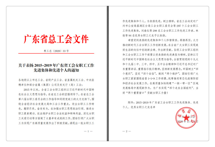 近日,從廣東省總工會傳來喜訊,我公司被評為“2015-2019年廣東省女職工工作先進集體”,特此報喜。