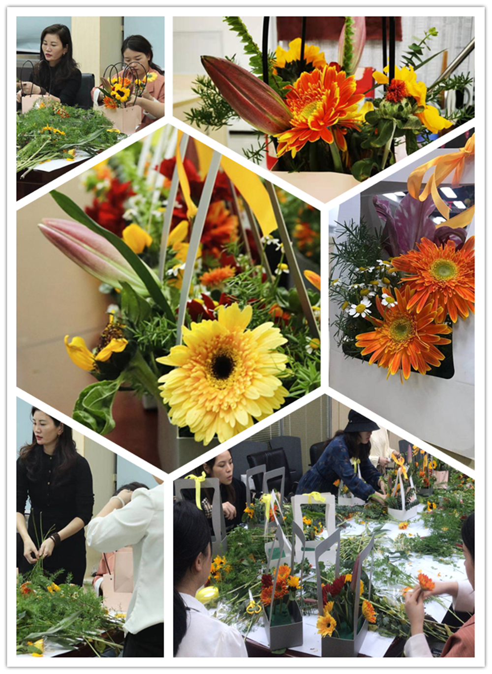 陽春三月,草長鶯飛。節日當天,各式各樣的鮮花和節日祝福賀卡紛紛飛到女神手中,滿是深深的祝福,祝福女神們身體健康、青春永駐。書畫攝影協會也趁著節日來臨之際,組織了插花活動,為女神們準備了象征著年輕、美麗、熱愛的向日葵、百合、菊花、雞蛋花等多種鮮花,傳遞著對女職工的美好祝福。