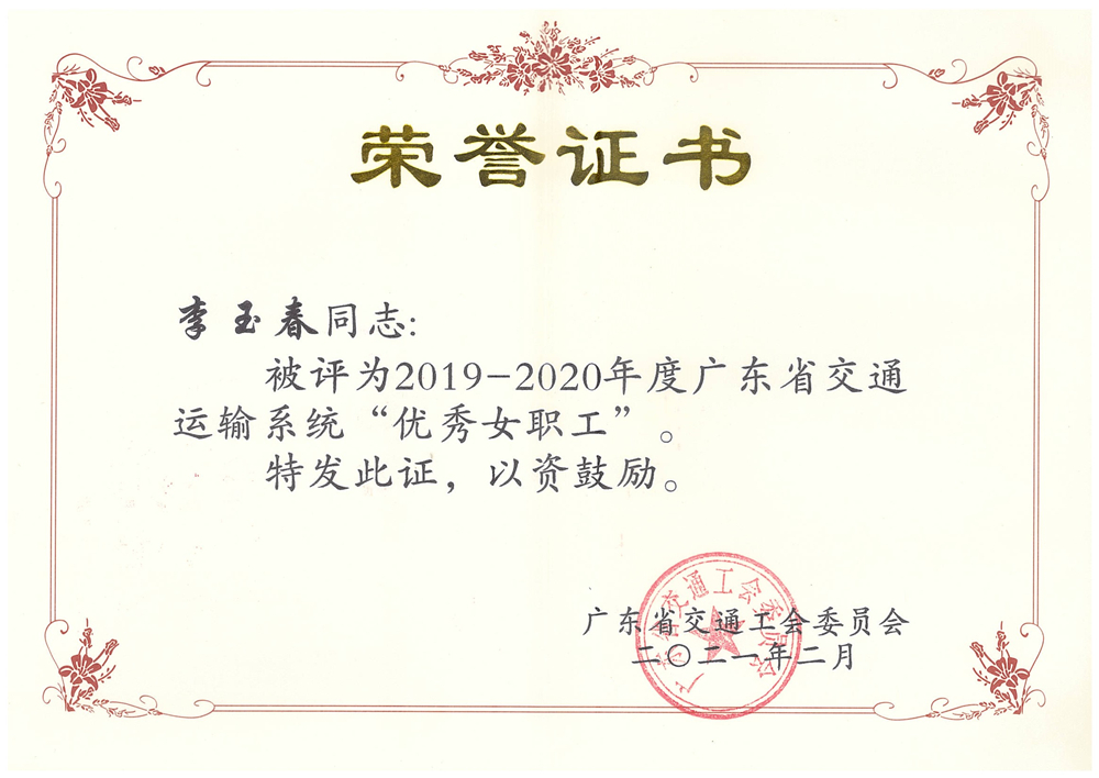 近日,公司工會被廣東省交通工會委員會授予20192020年度廣東省交通運輸系統“先進職工之家”榮譽稱號;公司董事長李江山同志被評為20192020年度廣東省交通運輸系統“優秀職工之友”,人力資源部主任李玉春同志被評為“優秀女職工”。