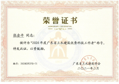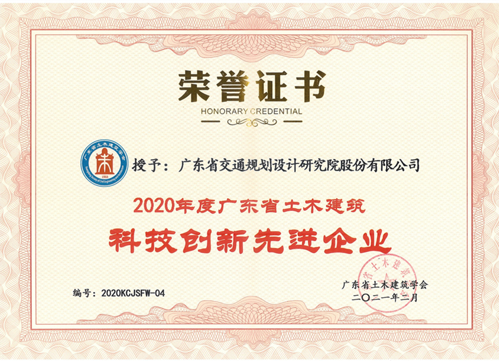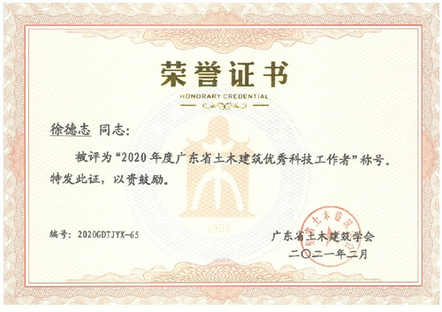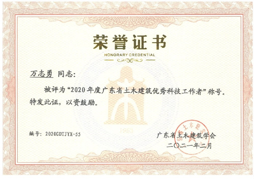 近日,公司被廣東省土木建筑學會授予“2020年度廣東省土木建筑科技創(chuàng)新先進企業(yè)”榮譽稱號;公司副總工程師梁志勇和萬志勇、巖土勘察院院長張金平、第四設計院總工程師徐德志4人被評為“2020年度廣東省土木建筑優(yōu)秀科技工作者”。特此報喜。