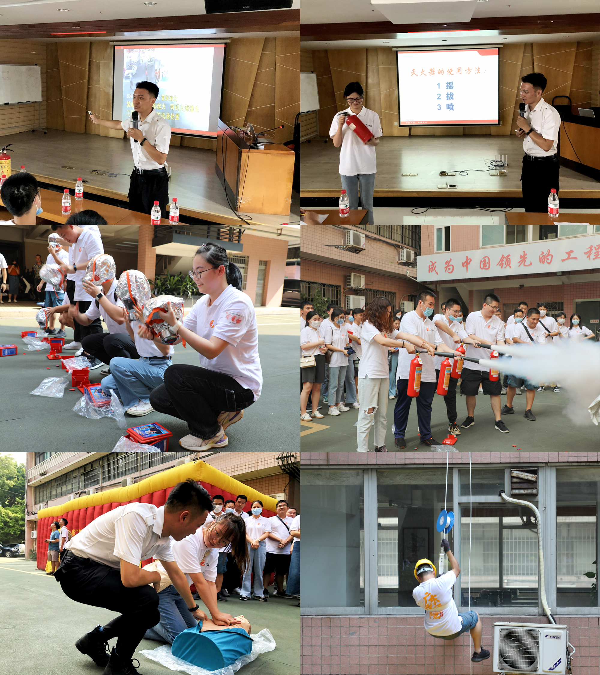此外,為提高員工安全意識,培養員工在突發情況下的避險自救能力,集團邀請了消防教育專業機構舉辦消防知識講座,并在現場開展濃煙環境逃生、高樓緩降逃生、防毒面具與滅火器使用演練以及心肺復蘇示范教學,有效提高了員工的安全意識和面對突發險情的處置能力。