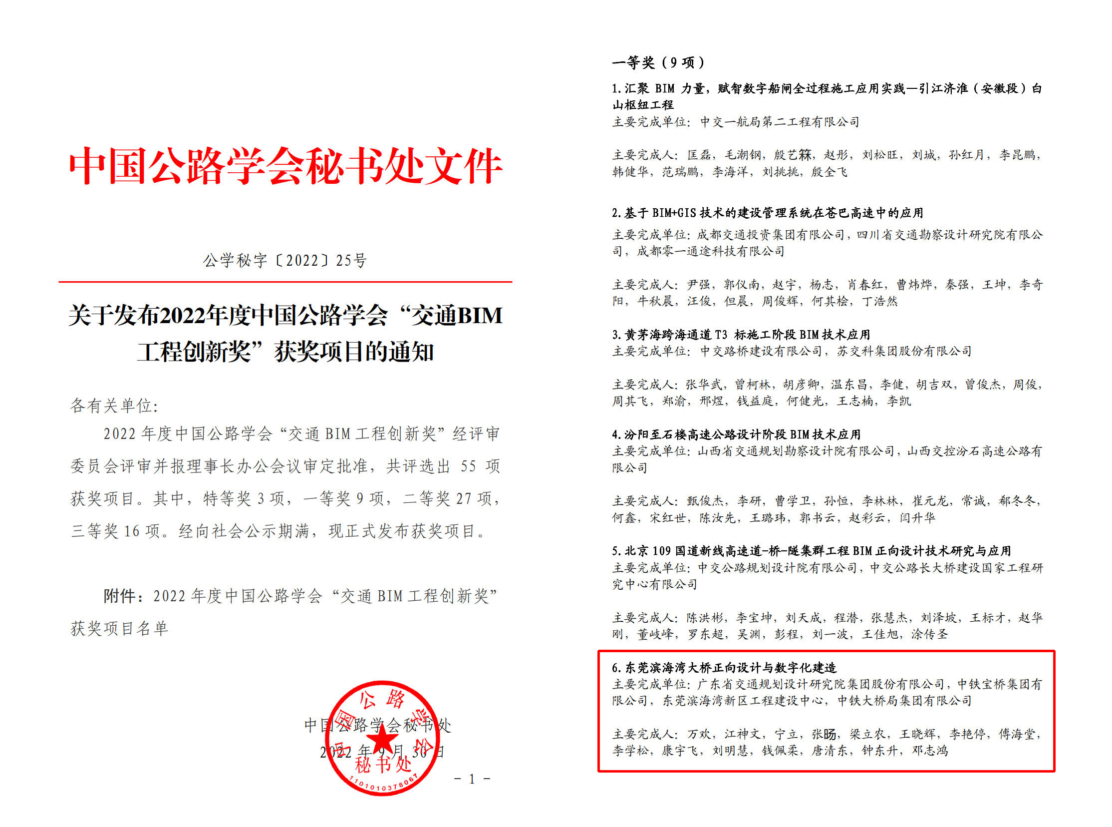 集團《東莞濱海灣大橋正向設計與數字化建造》項目榮獲中國公路學會“交通BIM工程創新獎”一等獎