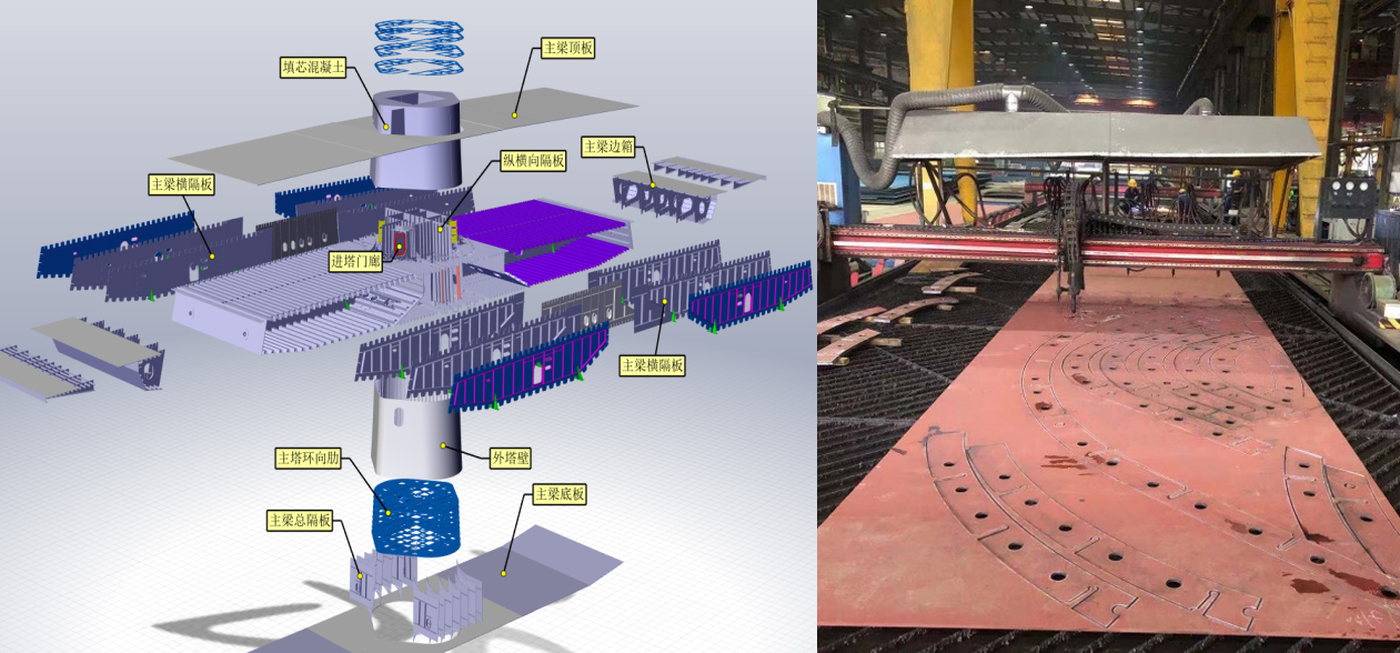 根據項目特點,集團依托EPC設計施工總承包模式,進行了復雜橋梁正向設計與數字化建造的創新實踐。創新性的橋梁正向設計技術體系框架以及自主開發的扁平式鋼箱梁專家系統實現了復雜鋼結構設計過程數字化,利用設計數據實現二維圖紙與三維模型“共源”的技術創新成果,實踐了正向設計理念,拓展了鋼結構數字化技術應用的深度和廣度。