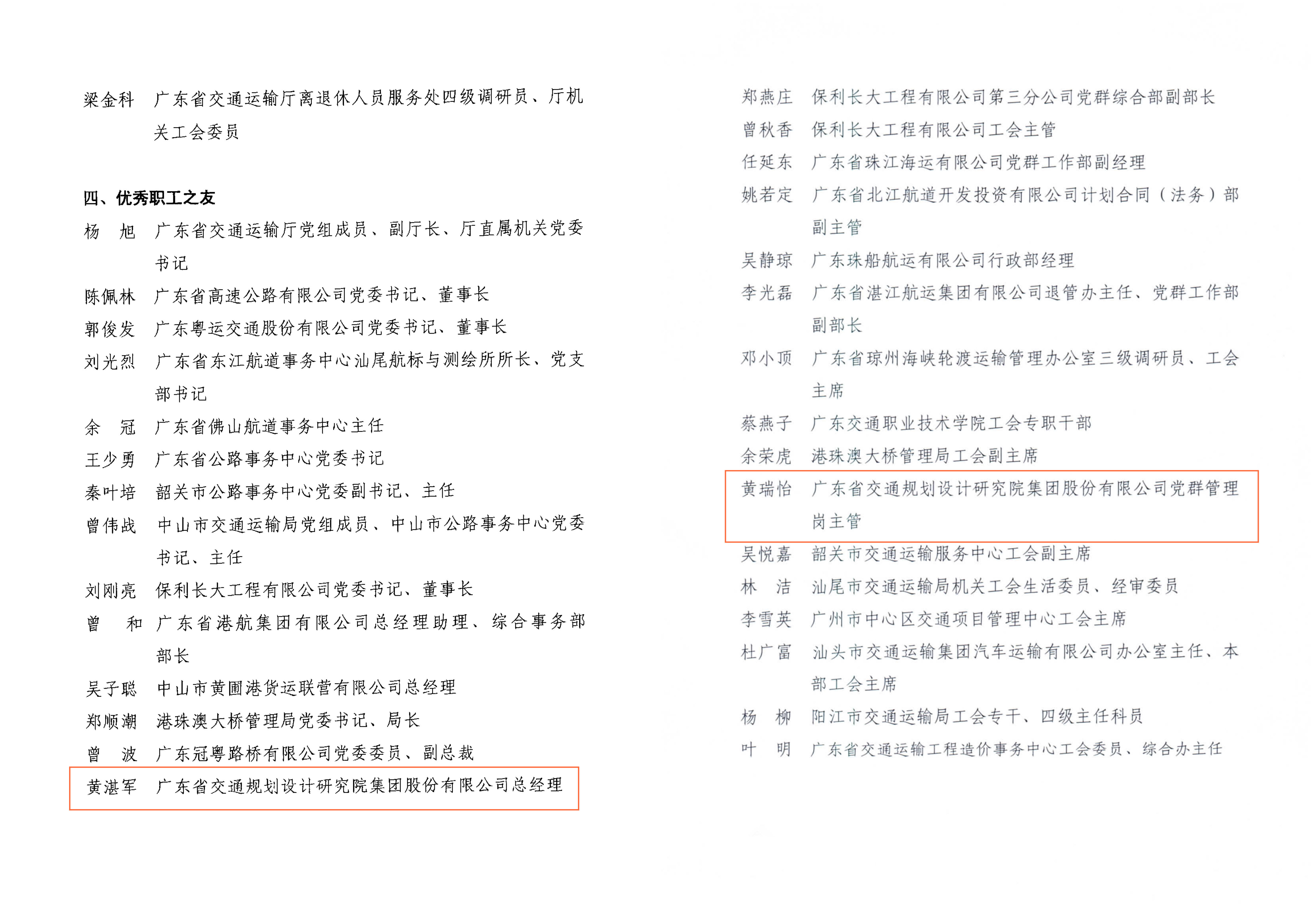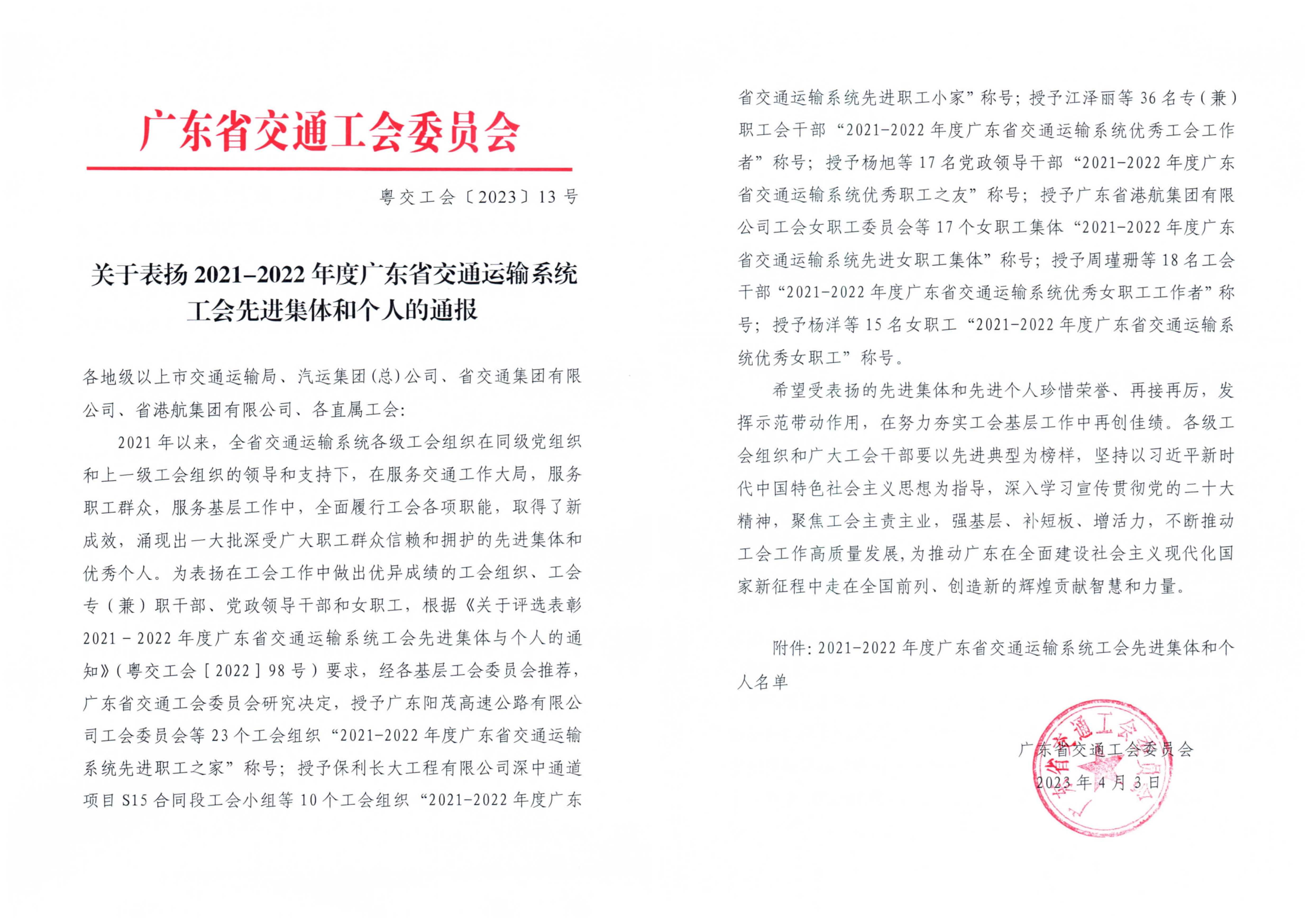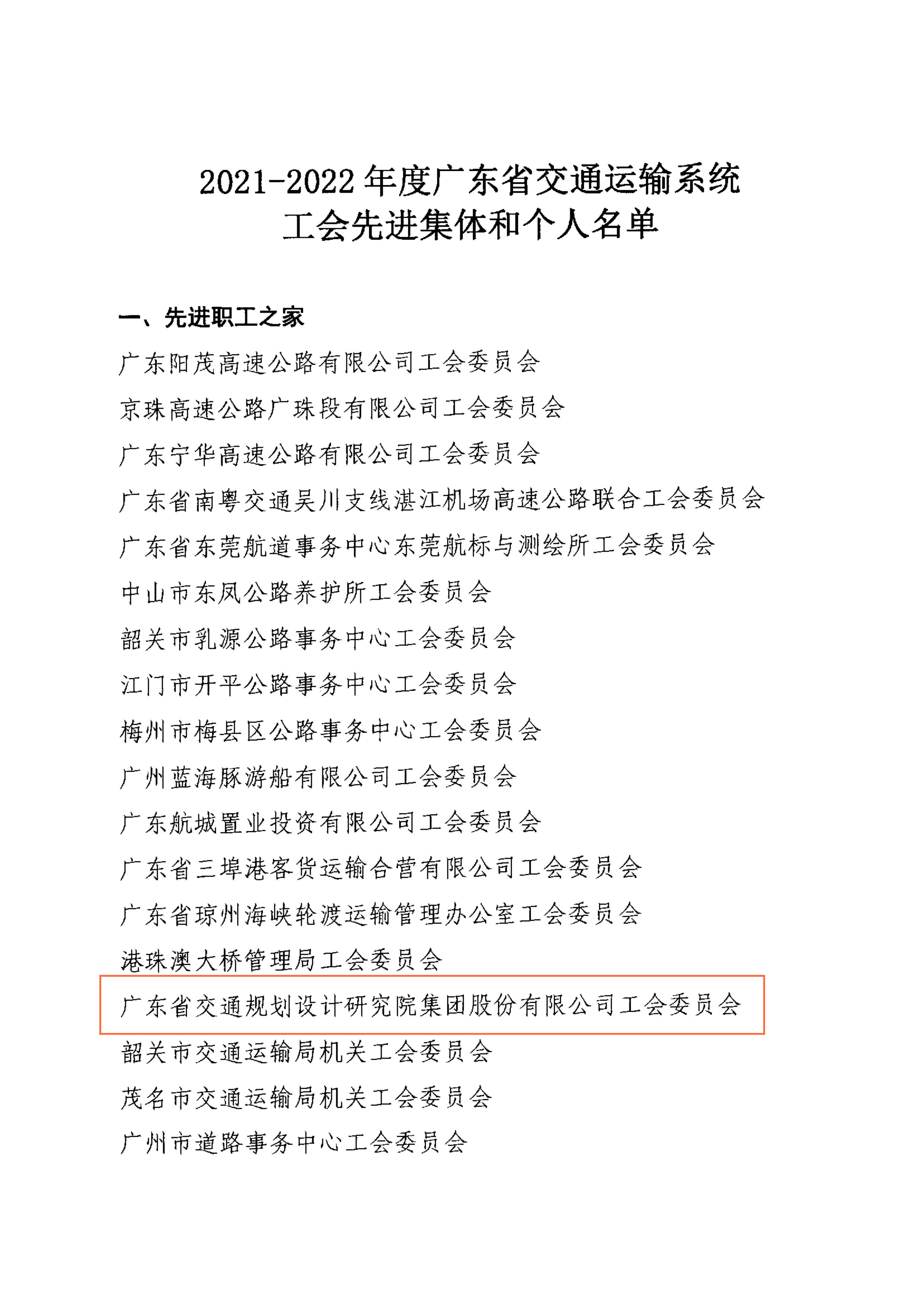 近日,集團(tuán)工會(huì)被廣東省交通工會(huì)委員會(huì)授予2021-2022年度廣東省交通運(yùn)輸系統(tǒng)“先進(jìn)職工之家”榮譽(yù)稱(chēng)號(hào);集團(tuán)總經(jīng)理黃湛軍獲評(píng)為“優(yōu)秀職工之友”,綜合管理辦公室黃瑞怡獲評(píng)為“優(yōu)秀工會(huì)工作者”。特此報(bào)喜!