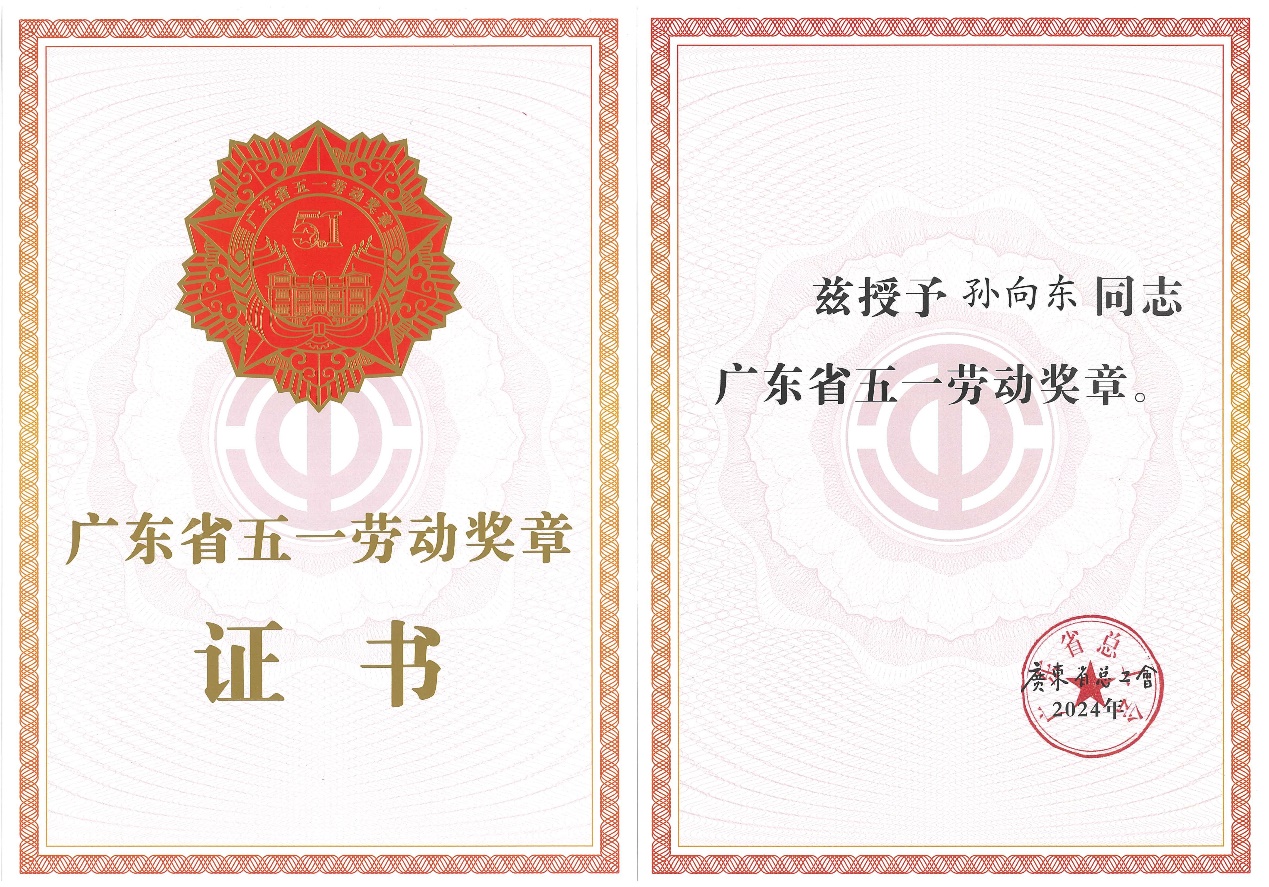 近日,為表彰先進,樹立典型,弘揚勞模精神、勞動精神、工匠精神,廣東省總工會發布2024年廣東省五一勞動獎狀、獎章和工人先鋒號表彰名單。公司總工程師孫向東榮獲“廣東省五一勞動獎章”榮譽稱號。
