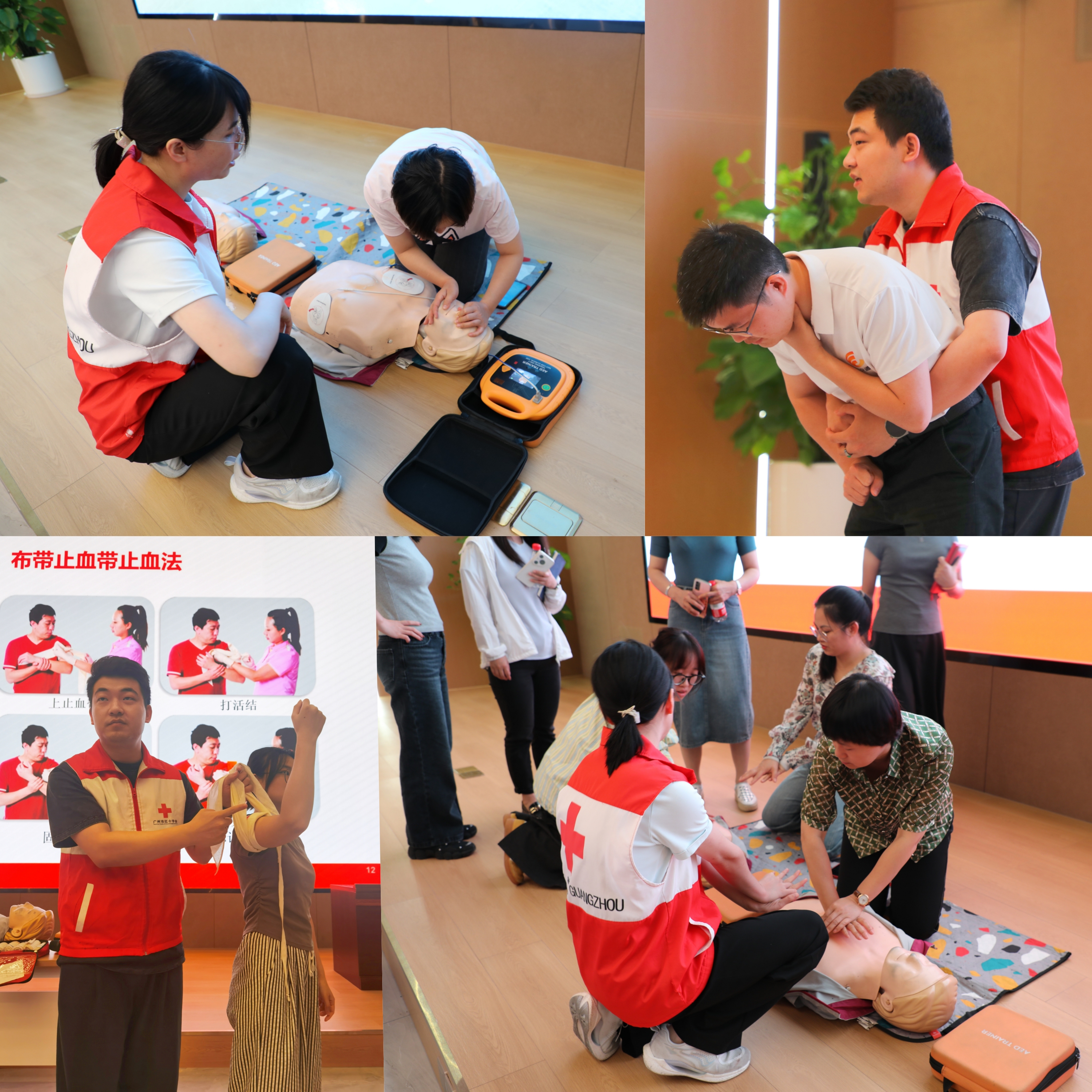 培訓現場,市紅十字會應急救護講師結合救護案例,指出了常見的急救誤區,提供了正確的急救觀念及講解了心肺復蘇術、AED的操作使用、氣道異物梗阻的處理、外出血的止血與包扎等應急救護知識,同時,模擬演示了各項應急救護的操作細節。