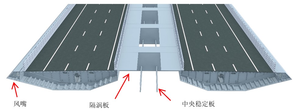 主橋抗風:橋位設計風速達46m/m2,針對性提出了分體式鋼箱梁結構,提高顫振穩定性。為研究渦振控制措施,與多所高校一起完成了近150種主梁斷面的氣動選型,首次提出了“風嘴+水平隔渦板+下中央穩定板”的綜合氣動措施,經風洞檢驗,實現了基本消除渦振的控制目標。