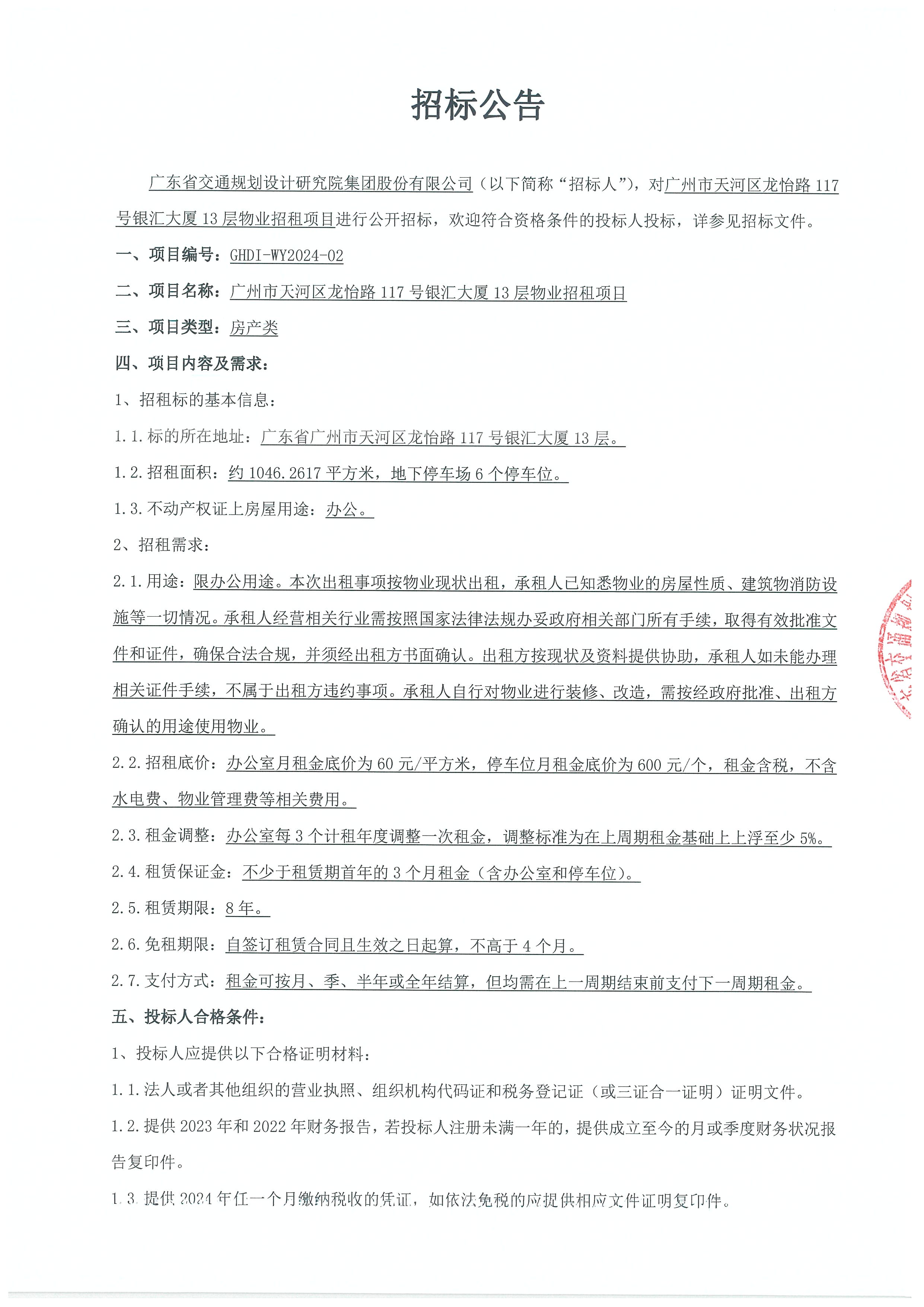 廣州市天河區龍怡路117號銀匯大廈13層物業招租項目招標公告