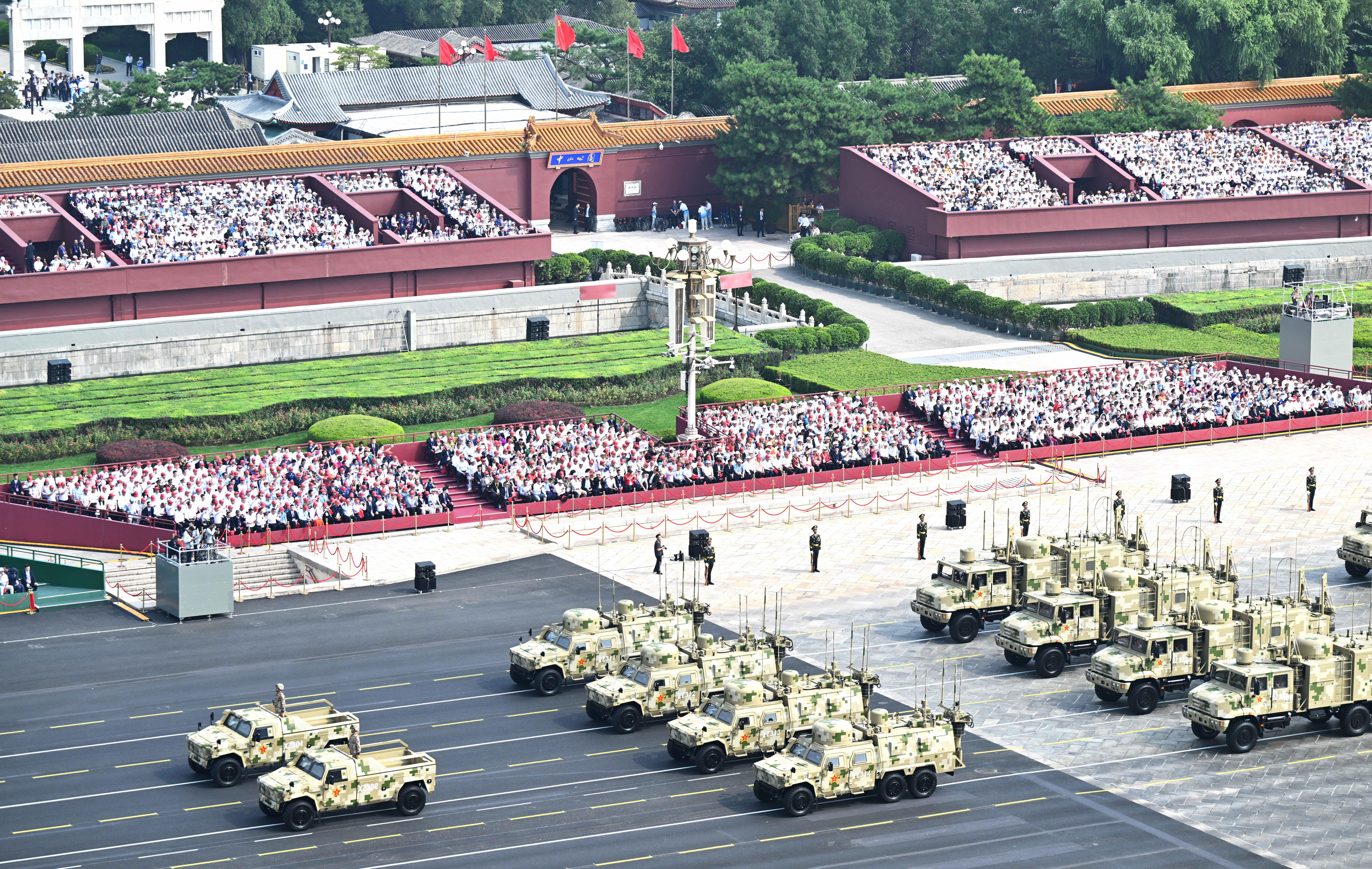 此次閱兵編設45個方(梯)隊,包括空中護旗梯隊、徒步方隊、戰(zhàn)旗方隊、裝備方隊、空中梯隊等,展現(xiàn)了部隊的實戰(zhàn)化特點。其中,軍事航天部隊、網(wǎng)絡空間部隊、信息支援部隊、聯(lián)勤保障部隊等戰(zhàn)略兵種首次集中亮相。裝備方隊中還展示了無人、水下、網(wǎng)電等新型作戰(zhàn)力量群,以及部分陸海空基戰(zhàn)略重器和高超精打裝備。他們威武雄壯地通過天安門,接受黨和人民的檢閱,吸引了全世界的目光。