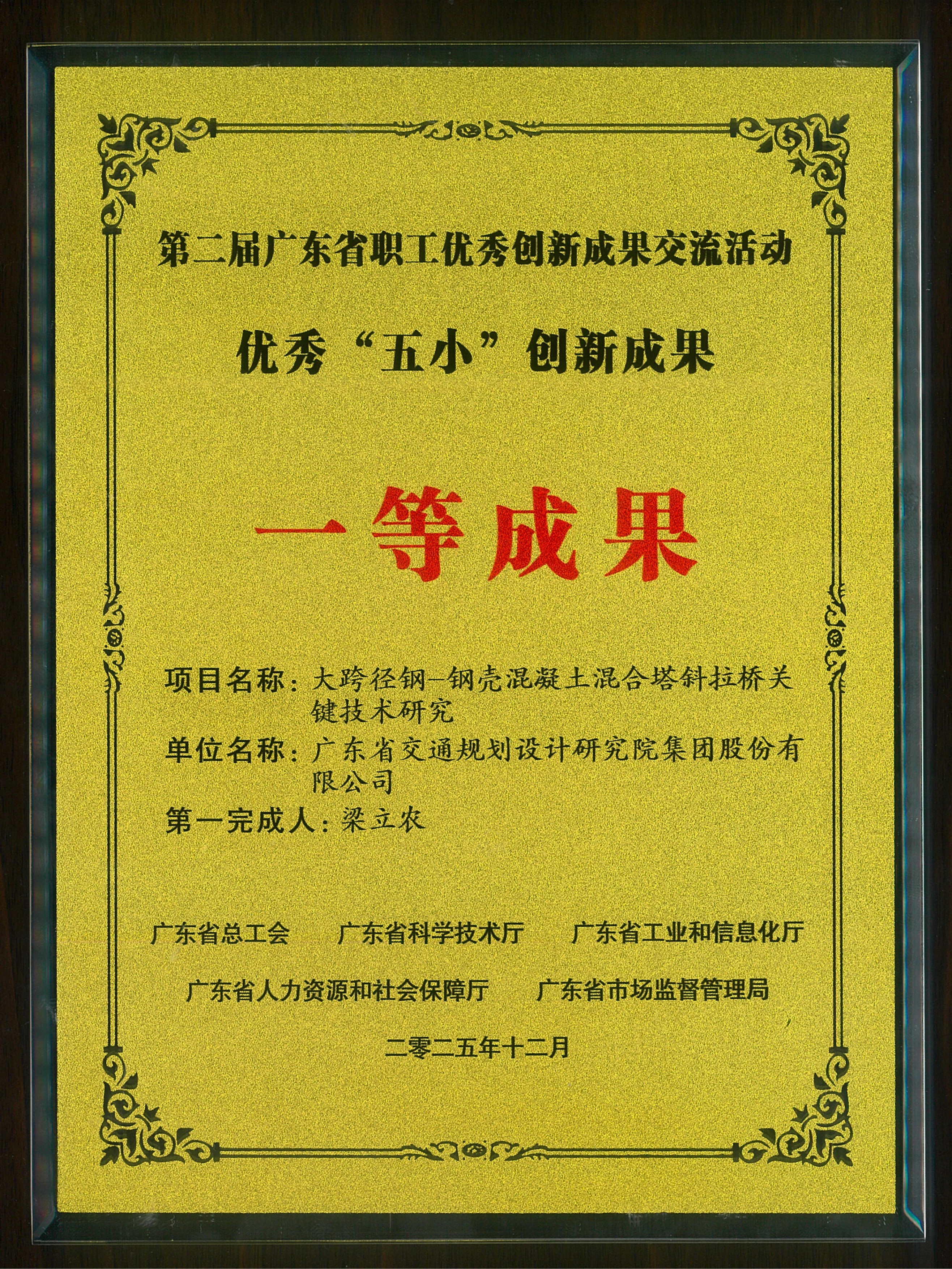 公司梁立農創新工作室《大跨徑鋼-鋼殼混凝土混合塔斜拉橋關鍵技術研究》項目獲第二屆廣東省職工優秀創新成果交流活動一等成果獎