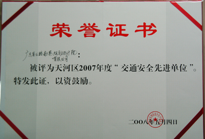 2007年,在公司領導的正確領導和全體員工的共同努力下,我司狠抓公務車行車安全工作,實現(xiàn)全年安全行車無事故,安全行車里程達140余萬公里,近日,被廣州市天河區(qū)安全生產(chǎn)委員會授予“2007年度交通安全先進單位”稱號,特此報喜。