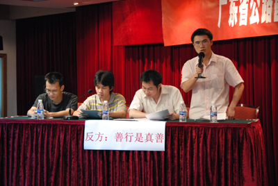 本次辯論賽共分兩場,第一場的辯題應時而作,是以抗震救災為時代背景的“善心與善行,何是真善”,第二場辯題則結合員工發展,直指社會現實,是“在個人與社會之間,個人命運究竟由誰掌握”。選手們就此展開了激烈的辯論,慷慨陳詞,滔滔不絕。爭先恐后、針鋒相對的自由辯論把整個辯論賽推向了高潮。兩位“最佳辯手”既在此找到了發揮的空間,更找到了表現的舞臺,給評委和觀眾留下了思維敏捷、語言流利的深刻印象。