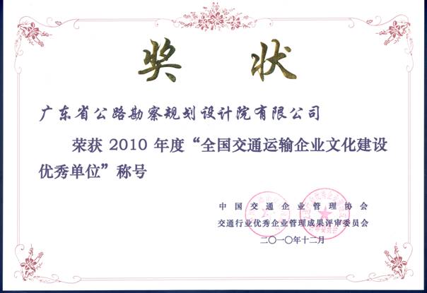 12月4日,第五屆全國(guó)交通運(yùn)輸企業(yè)文化建設(shè)論壇在長(zhǎng)沙隆重召開,會(huì)上對(duì)2010年度全國(guó)交通運(yùn)輸企業(yè)文化建設(shè)優(yōu)秀單位及個(gè)人進(jìn)行了表彰,我司繼2009年后再次榮獲“全國(guó)交通運(yùn)輸企業(yè)文化建設(shè)優(yōu)秀單位“殊榮。
