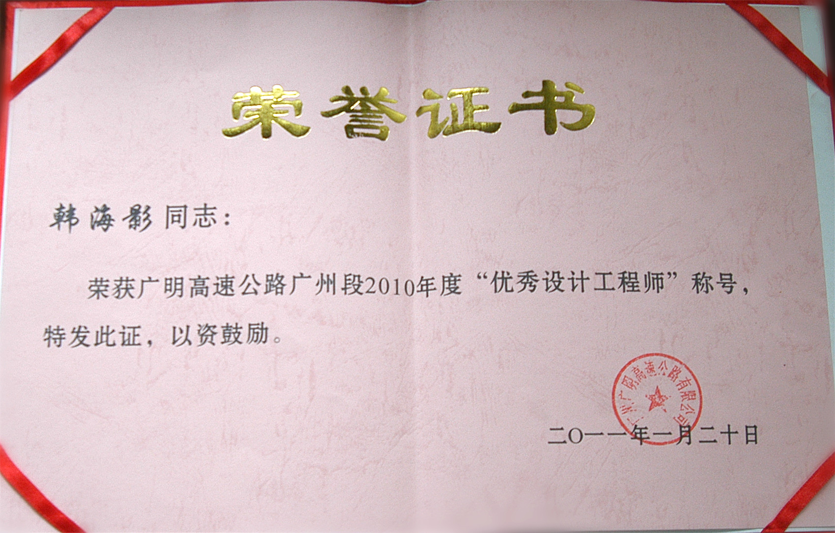 近日,我司第二路橋設計部韓海影同志受到業主單位廣州廣明高速公路有限公司表彰,榮獲廣明高速公路廣州段2010年度“優秀設計工程師”稱號,為公司贏得了良好的聲譽,特此祝賀!