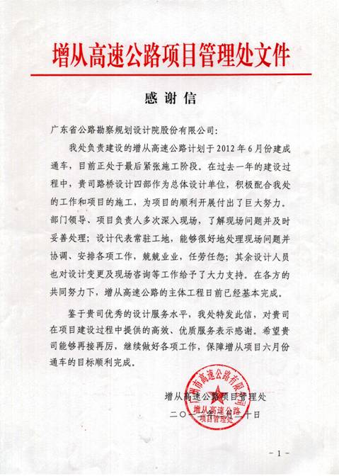 近日,增從高速公路項(xiàng)目管理處發(fā)來感謝信,對(duì)第四路橋設(shè)計(jì)部在增從高速公路建設(shè)中提供的“高效、優(yōu)質(zhì)”的設(shè)計(jì)后服務(wù)給予了充分肯定和高度贊揚(yáng)。這是今年以來,我司設(shè)計(jì)后服務(wù)工作第三次受到業(yè)主單位來函表揚(yáng)。特表祝賀!