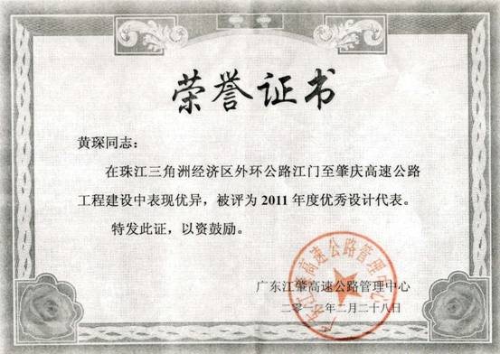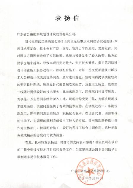 近日,廣東江肇高速公路管理中心發(fā)來表揚(yáng)信,高度肯定我司設(shè)計(jì)后服務(wù),并對以第四路橋設(shè)計(jì)部為主的服務(wù)團(tuán)隊(duì)在江肇高速公路B合同段的設(shè)計(jì)后服務(wù)表示滿意和感謝。同時,第四路橋部黃琛被廣東江肇高速公路管理中心評為2011年度優(yōu)秀設(shè)計(jì)代表。特表祝賀!