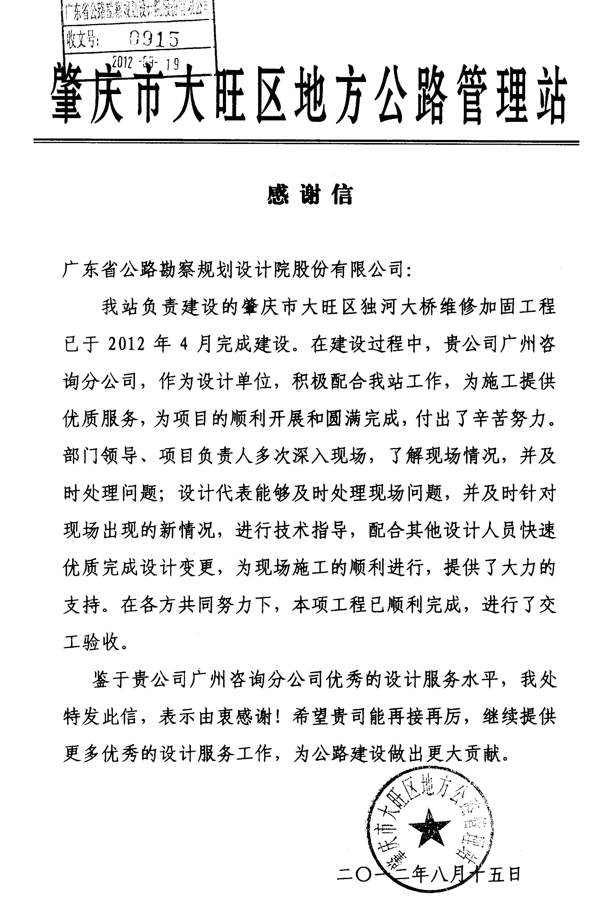 近日,肇慶市大旺區地方公路管理站發來感謝信,高度肯定我司設計后服務工作,對咨詢分公司服務團隊在獨河大橋維修加固工程設計后服務過程中表現出的“優秀的設計服務水平”表示滿意和感謝。目前該項目已順利完工,進行了交工驗收。