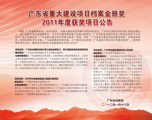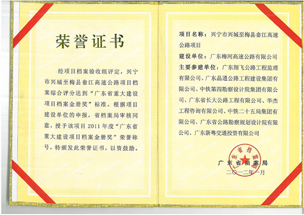 近日獲悉,由廣東翔飛公路工程監理有限公司主要承接的興畬高速公路項目檔案榮獲2011年度“廣東省重大建設檔案金冊獎”,這是省交通系統第三個獲此殊榮的項目,也是公司繼廣東西部沿海高速公路珠海段支線項目后再獲“金冊獎”殊榮。“廣東省重大建設項目檔案金冊獎”由省檔案局和省發改委2007年根據國家檔案局和發改委的有關精神聯合設立,2011年僅三個項目獲此殊榮。