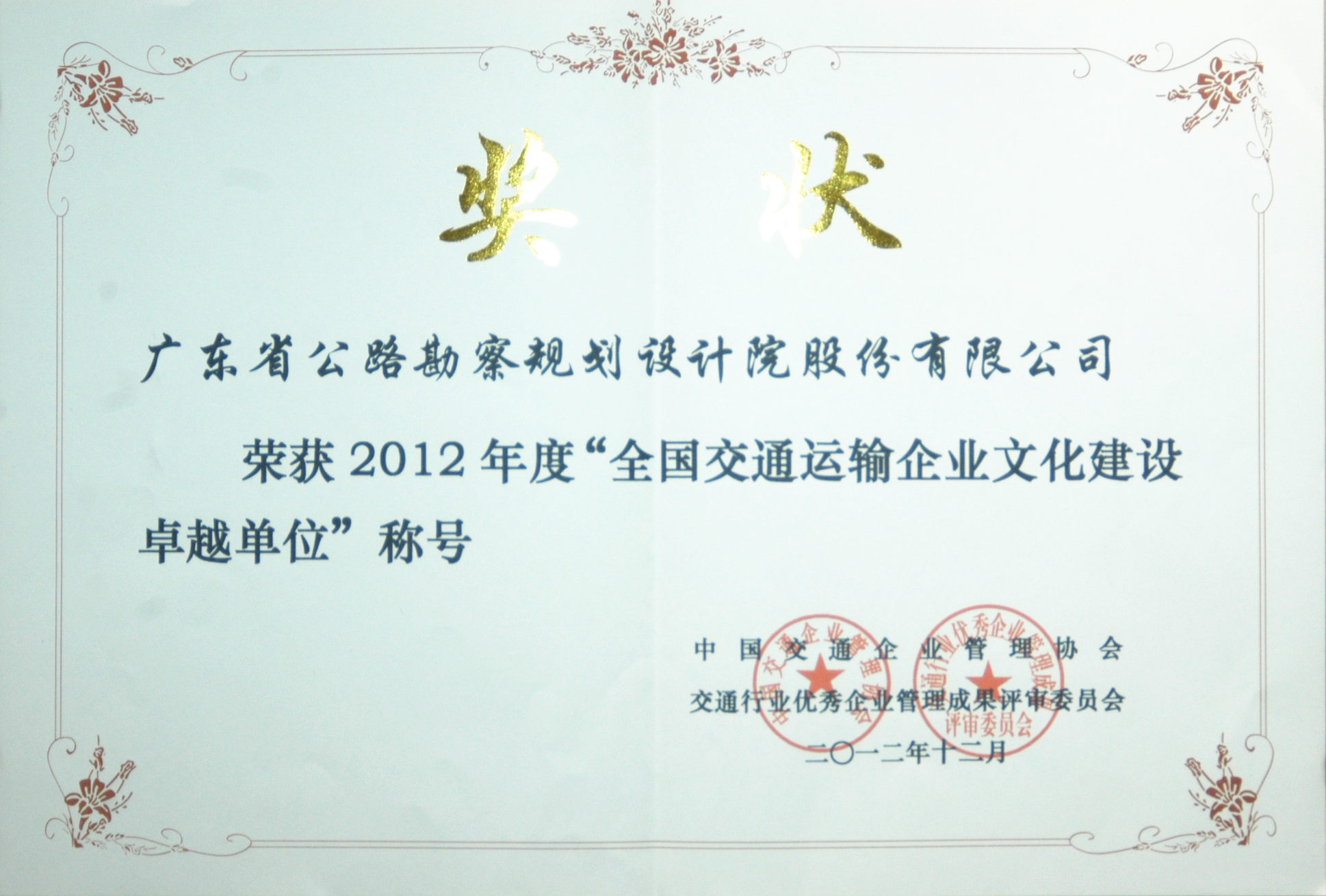 熱烈祝賀公司2012年度蟬聯(lián)“全國交通運輸企業(yè)文化建設(shè)卓越單位”稱號。繼2009、2010兩年榮獲“全國交通運輸企業(yè)文化建設(shè)優(yōu)秀單位”、2011年榮獲“全國交通運輸企業(yè)文化建設(shè)卓越單位”稱號后,這是公司企業(yè)文化建設(shè)第四次獲此殊榮。該獎由中國交通企業(yè)管理協(xié)會、交通行業(yè)優(yōu)秀企業(yè)管理成果評審委員會聯(lián)合頒發(fā)。