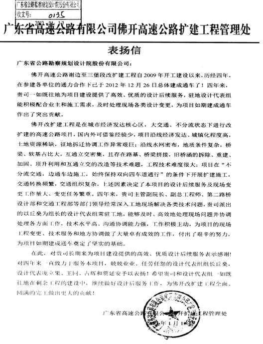 近日,佛開擴(kuò)建工程管理處發(fā)來表?yè)P(yáng)信,高度肯定我司設(shè)計(jì)后服務(wù),并對(duì)第二路橋分公司設(shè)計(jì)代表組丘燊組長(zhǎng)、設(shè)計(jì)代表龐立果、王同、市政與交通工程設(shè)計(jì)部占輝、和立公司賈延安等人在佛開高速公路謝邊至三堡段改擴(kuò)建項(xiàng)目上的設(shè)計(jì)后服務(wù)表示滿意和感謝。特表祝賀!