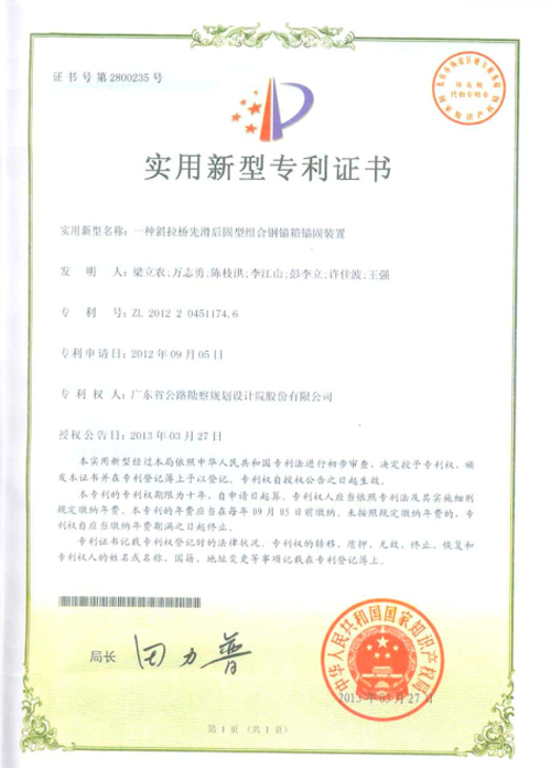 公司研發(fā)的“一種斜拉橋先滑后固型組合鋼錨箱錨固裝置”,于2013年3月27日被中華人民共和國國家知識產權局授予實用新型專利權。