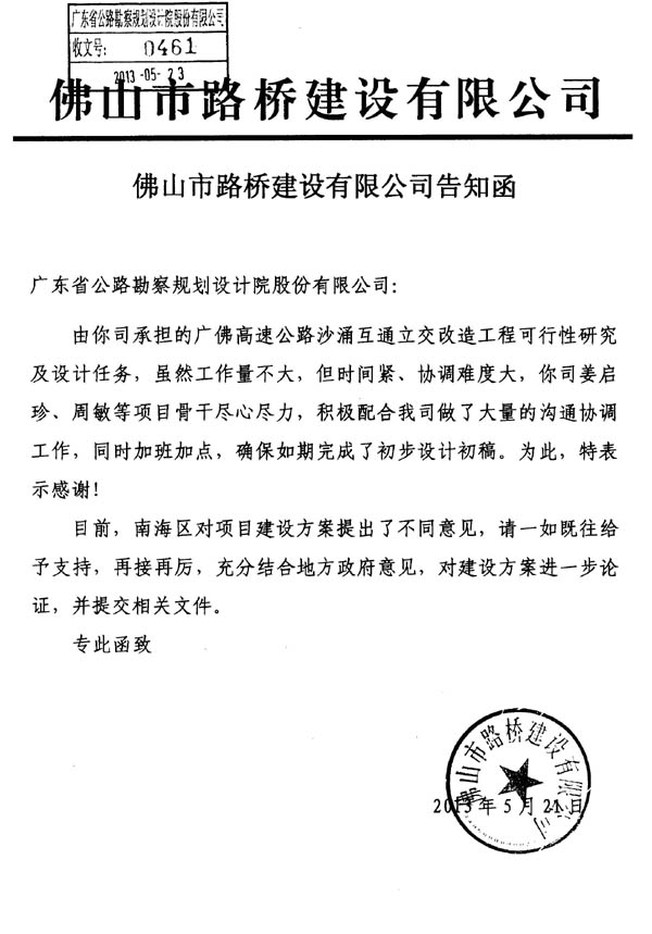 近日,佛山市路橋建設(shè)公司對(duì)我司在廣佛高速沙涌互通立交改造工程可行性研究及設(shè)計(jì)工作中所做出的努力發(fā)專(zhuān)函給予肯定,對(duì)第一路橋設(shè)計(jì)分公司姜啟珍總經(jīng)理、設(shè)計(jì)師周敏等項(xiàng)目成員表示感謝。該項(xiàng)目成員竭誠(chéng)服務(wù)業(yè)主的行動(dòng),為公司贏得了榮譽(yù)。