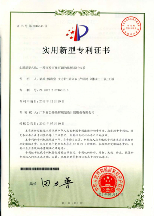 2、“一種可檢可換可調的拱橋吊桿體系”,被授予實用新型專利權。