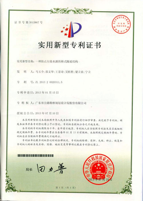 3、“一種防止污染水源的橋式隧道結構”,被授予實用新型專利權。