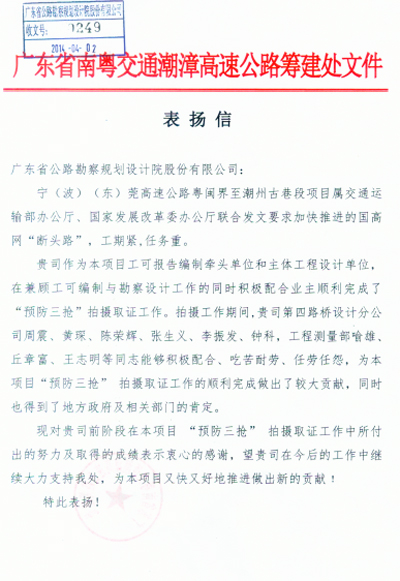 近日,省南粵交通潮漳高速公路籌建處發來表揚信,對我司在該項目“預防三搶”拍攝取證工作中作出的努力表示肯定和感謝。同時,點名表揚了第四路橋設計分公司及工程測量部等一批項目組成員。特此報喜。