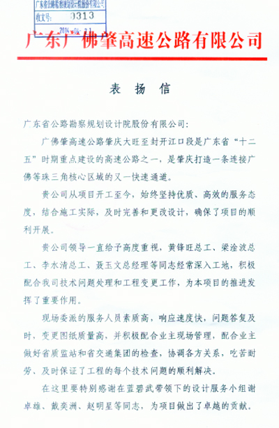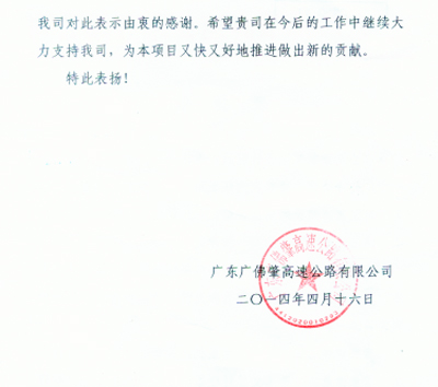 近日,廣佛肇高速公路有限公司發來表揚信,對我司在廣佛肇高速公路項目中提供的優質、高效的設計后服務表示高度贊揚,對黃鋒旺、梁淦波、李水清、聶玉文等一批部門領導和藍碧武等一批設計后服務人員表示感謝。特此報喜。