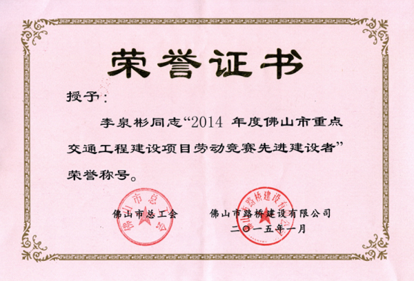 近日,我司第三路橋分公司駐廣明高速公路陳村至西樵段設計代表李泉彬同志受到佛山市總工會和佛山市路橋建設有限公司聯合表彰,榮獲2014年度“佛山市重點交通工程建設項目勞動競賽先進建設者”稱號,李泉彬同志曾獲“先進工作者”、“先進建設者”稱號,為公司樹立了良好的外部形象,贏得了聲譽,特表祝賀!