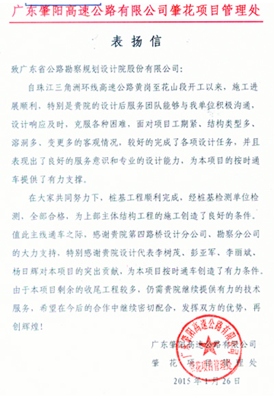 近日,廣東肇陽高速公路有限公司肇花項目管理處發來表揚信,對我司在珠江三角洲環線高速公路黃崗至花山段項目中提供的高效、優質服務表示贊揚,同時對負責該項目的第四路橋設計分公司等組織和個人給予了通報表揚。特此報喜。