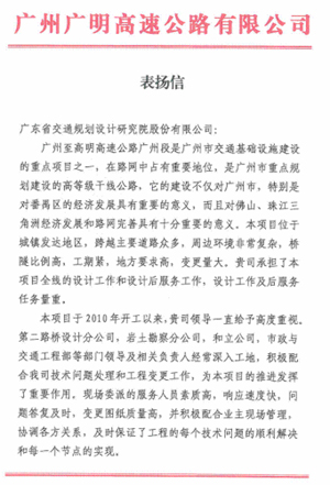 廣明高速公路項目設計后服務受業主單位表彰