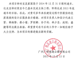 近日,廣州廣明高速公路有限公司發來表揚信,對我司在廣州至高明高速公路廣州段中提供的高效、優質服務表示贊揚,同時對負責該項目的第二路橋設計分公司等組織及個人給予了通報表揚。目前該項目鐘村至吳家圍段于2014年12月31日順利通車,化龍至鐘村段已基本完成主體工程,即將達成2015年底通車的目標。