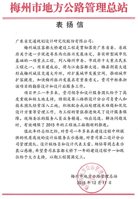 梅州城區(qū)客都大橋項(xiàng)目設(shè)計(jì)后服務(wù)受業(yè)主單位表彰