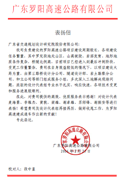 近日,廣東羅陽高速公路有限公司發來表揚信,對我司在羅陽高速公路項目中的突出表現表示贊揚,同時對負責該項目的第三路橋設計分公司等組織和設計代表等個人給予了通報表揚。特此報喜。