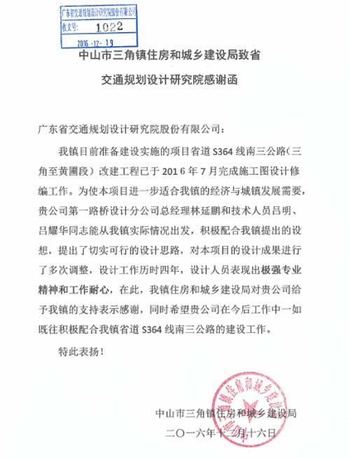 近日,中山市三角鎮住房和城鄉建設局發來感謝函,對我司第一路橋設計分公司等組織和設計人員在省道S364線南三公路(三角至黃圃段)改建工程的施工圖設計修編工作中能考慮實際情況,多次進行設計修編,表現出極強的專業精神和工作耐心表示高度贊揚,同時對我司的支持工作表示感謝。特此報喜!