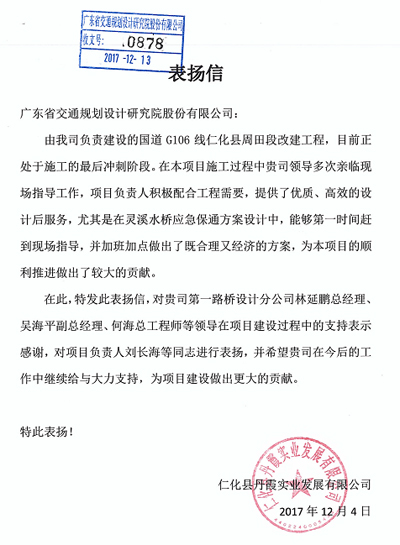 近日,仁化縣丹霞實業發展有限公司發來表揚信,對我司在國道G106線仁化縣周田段改建工程項目中提供的優質、高效的設計后服務表示肯定和贊揚,對負責該項目的第一路橋設計分公司及其相關領導、項目負責人給予了通報表揚,特此報喜!