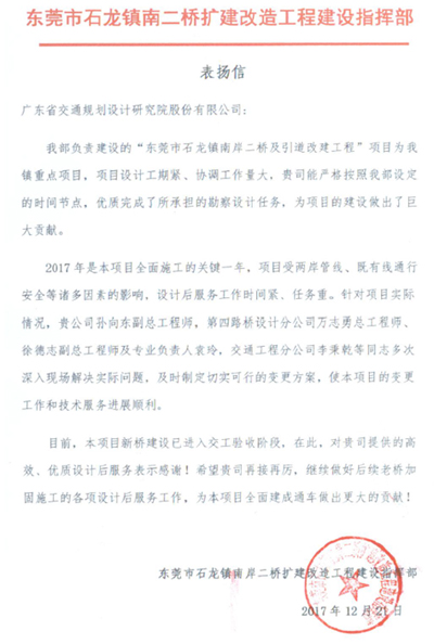 近日,東莞市石龍鎮南岸二橋擴建改造工程建設指揮部發來表揚信,對我司在東莞市石龍鎮南岸二橋及引道改建工程項目中提供優質的勘察設計及服務質量表示滿意和肯定,對負責該項目的相關部門和相關負責人、設計服務人員給予了充分肯定,特此報喜!