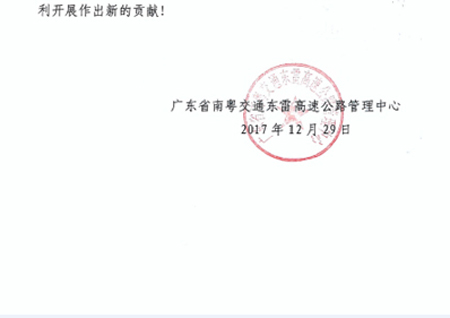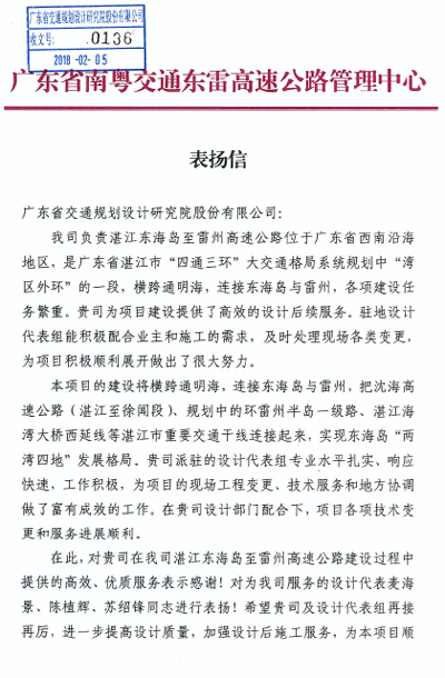 近日,廣東省南粵交通東雷高速公路管理中心發(fā)來表揚信,對我司在湛江東海島至雷州高速公路項目中提供優(yōu)質(zhì)、高效的設(shè)計后服務(wù)表示肯定,對負(fù)責(zé)該項目的設(shè)計代表麥海景、陳植輝、蘇紹鋒給予了通報表揚,特此報喜!