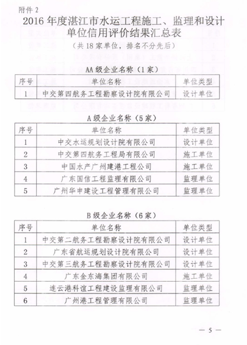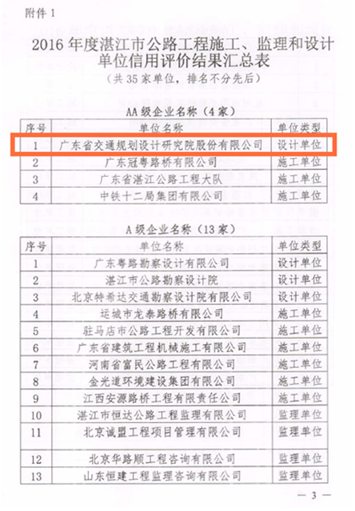近日,湛江市交通運輸局公布了2016年度湛江市公路水運工程從業單位信用評價結果。我公司榮獲2016年度湛江市公路工程施工、監理和設計單位信用評價AA級企業。