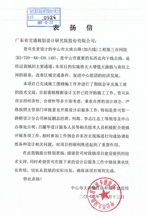 近日,中山市大涌鎮住房和城鄉建設局發來表揚信,對我司在中山市大南公路(加六線)工程第三合同段中提供優質的設計后服務表示肯定,對負責該項目的第一路橋設計分公司相關負責人林延鵬、何海、李志江,及中山辦事處服務人員呂明、呂耀華給予了通報表揚,特此報喜!