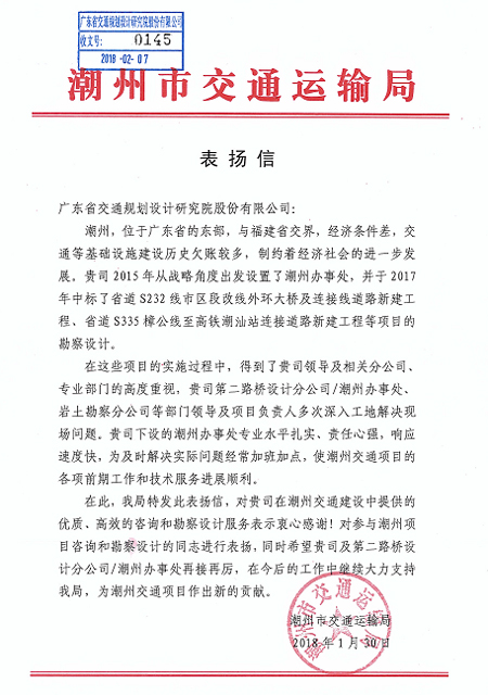 近日,潮州市交通運輸局發來表揚信,對我司在潮州市承擔的多個項目勘察設計工作及后服務表示肯定,肯定我司不斷深入市場一線,秉承專業、高效、負責的工作態度,提供高效、優質的設計后服務,為潮州市交通建設的發展作出了積極貢獻。同時,對負責該項目的第二路橋設計分公司潮州辦事處及相關項目人員給予了通報表揚。特此報喜!