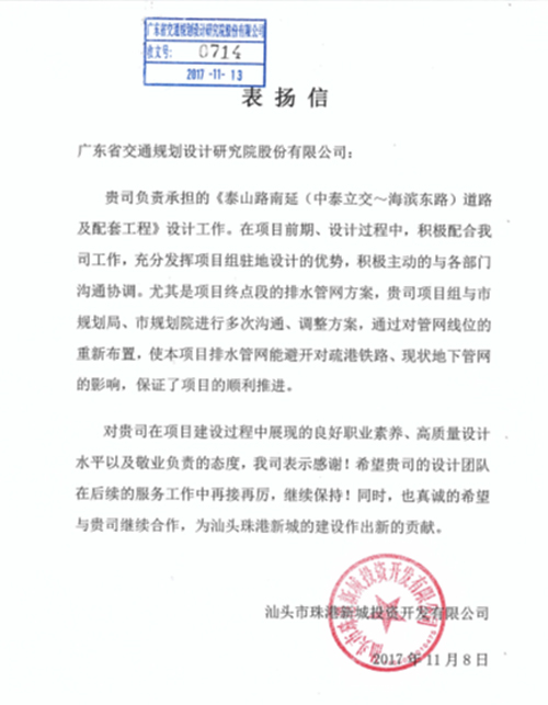 近日,汕頭市珠港新城投資開發有限公司發來表揚信,對我司在泰山路南延(中泰立交—海濱東路)道路及配套工程項目中提供的優質、高效、全面的設計及后服務表示感謝,對負責此次項目的市政設計分公司及項目團隊給予了充分肯定,特此報喜!