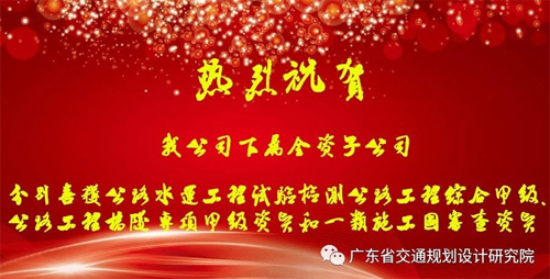 我公司下屬全資子公司分別喜獲公路水運工程試驗檢測公路工程綜合甲級、公路工程橋隧專項甲級資質和一類施工圖審查資質