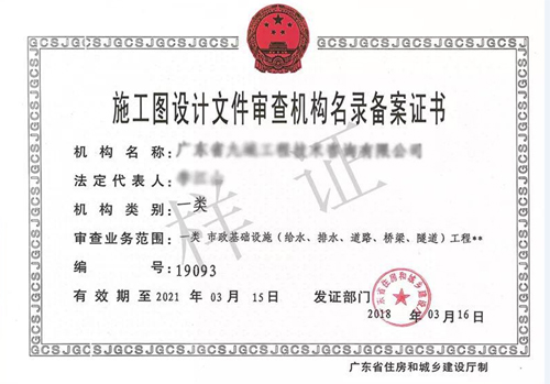 2018年3月16日,在廣東省住房和城鄉建設廳發布的《廣東省住房和城鄉建設廳關于廣東省九域工程技術咨詢有限公司等4家施工圖審查機構名錄備案審查結果的公告》中,我公司下屬全資子公司廣東省九域工程技術咨詢有限公司獲取一類施工圖審查資質,正式被錄入我省房屋建筑和市政基礎設施工程施工圖設計文件審查機構名錄。后期將通過市政設計業務帶動施工圖審查業務發展,形成市政設計與施工圖審查業務相輔相成,相互促進的良好發展局面。