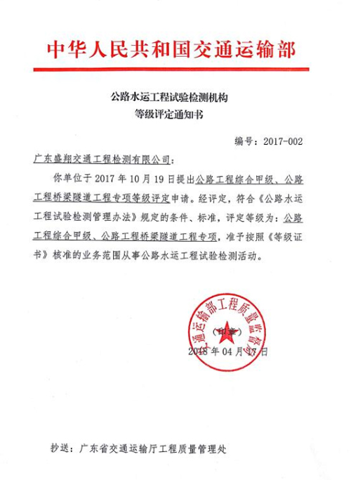 2018年4月17日,在交通運輸部工程質量監督局發布的《公路水運工程試驗檢測機構等級評定通知書》中,我公司下屬全資子公司廣東盛翔交通工程檢測有限公司正式獲得公路工程綜合甲級、公路工程橋梁隧道工程專項等級資質。標志著盛翔公司檢測監測技術服務水平邁上了一個新臺階。公路工程綜合甲級、公路工程橋梁隧道工程專項資質的獲得,在盛翔公司的戰略發展中具有里程碑式的重大意義。