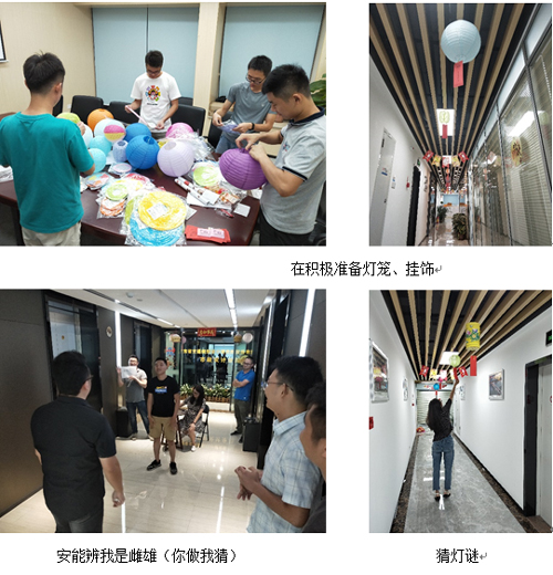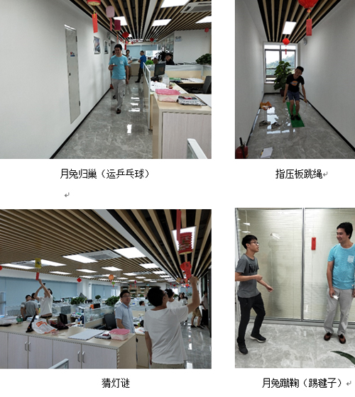 天花板下懸掛了一串串燈籠和燈謎;在辦公區的4個方位還設置了“月兔蹴鞠”“月兔歸巢”“安能辨我是雌雄”以及指壓板跳繩等游戲區和兌獎區,吸引大家參與其中。節日的氣氛洋溢在現場的每個角落。贏取到游戲中的精美禮品的大伙兒滿載而歸,在歡聲笑語中提前度過了一個快樂而有意義的中秋佳節。